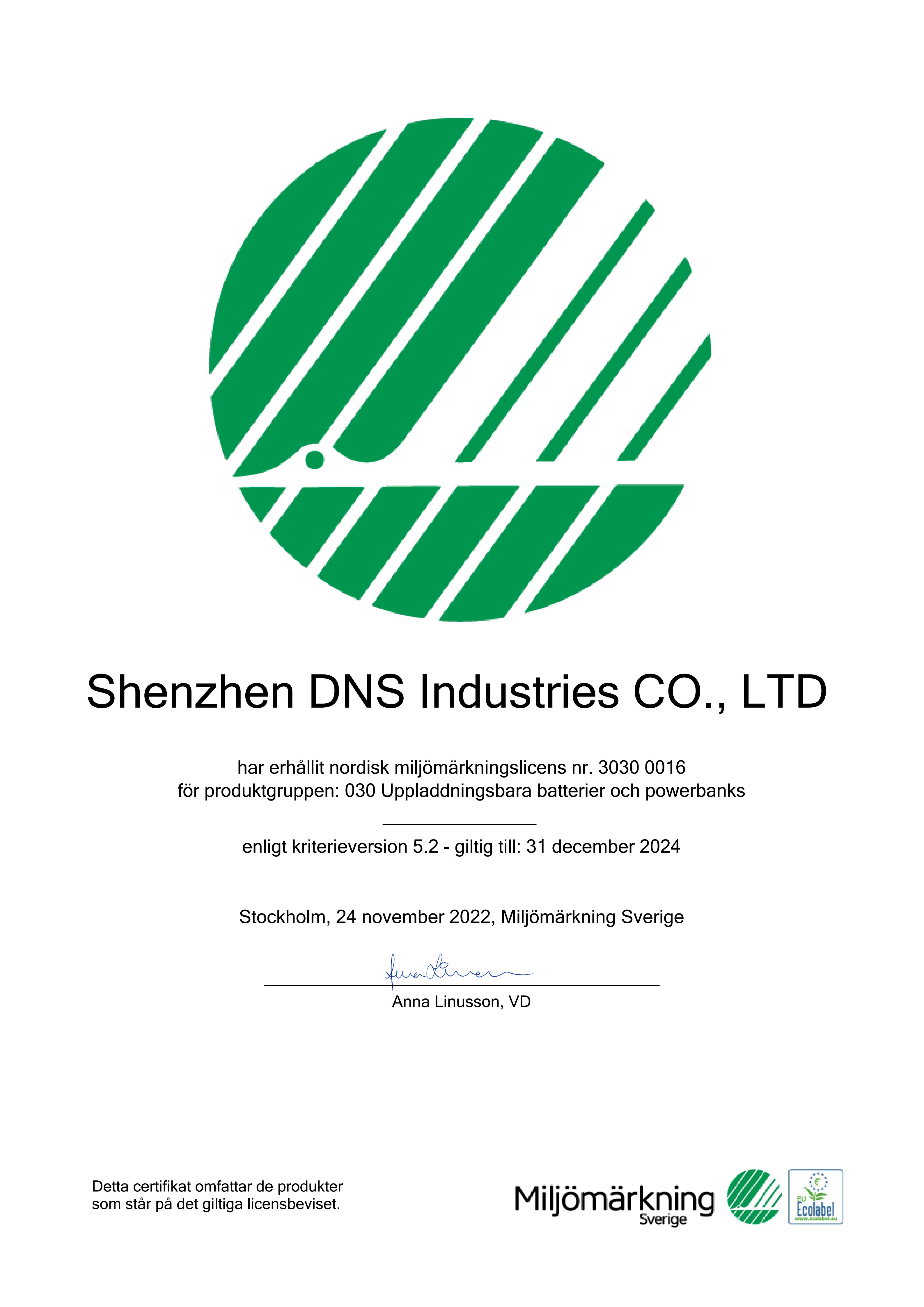 11月25日,深圳市和宏實業股份有限公司獲得北歐白天鵝生態標簽(Nordic Swan Ecolabel)認證, 成為全球首個獲得充電寶北歐白天鵝生態標簽認證的公司。慶祝和宏加入白天鵝家族,共同為綠色轉型而努力。